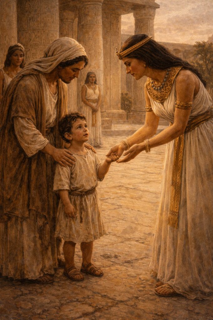 His mother hides him for three months, but when she can no longer conceal him, she places him in a basket among the reeds of the Nile. What appears to be an act of desperation becomes the beginning of God’s providential plan. Pharaoh’s daughter discovers the child, takes pity on him, and raises him in the royal household.