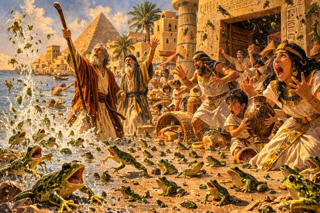 After the Nile was struck in the previous chapter, God commands Moses once again to confront Pharaoh. Through Aaron’s outstretched staff, frogs begin to swarm across Egypt. They invade homes, bedrooms, kitchens, and even the royal palace. What once symbolized fertility and life in Egyptian religion becomes a source of unbearable chaos.