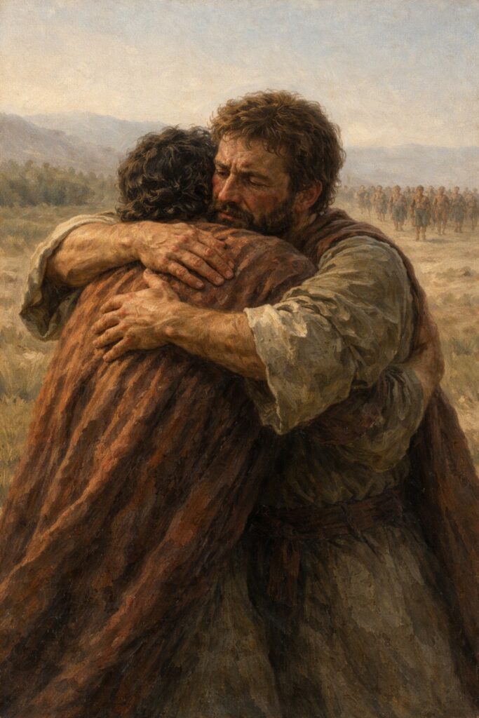 Jacob approaches Esau with humility, bowing himself to the ground seven times. Yet before any word is spoken, Esau runs to meet him, embraces him, and weeps with him. This moment is not the result of Jacob’s strategy or preparation. It is the work of God, who changed Esau’s heart. Grace arrives before punishment, and mercy replaces fear.