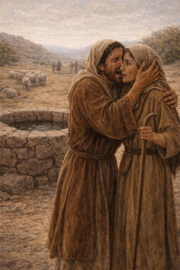 Jacob arrives in the land of the people of the east and encounters shepherds gathered around a well. This ordinary scene becomes the place where his future unfolds. When Rachel appears, Jacob’s life direction changes instantly. Scripture describes his love for her with unusual clarity, and Jacob willingly commits himself to years of labor for her sake.