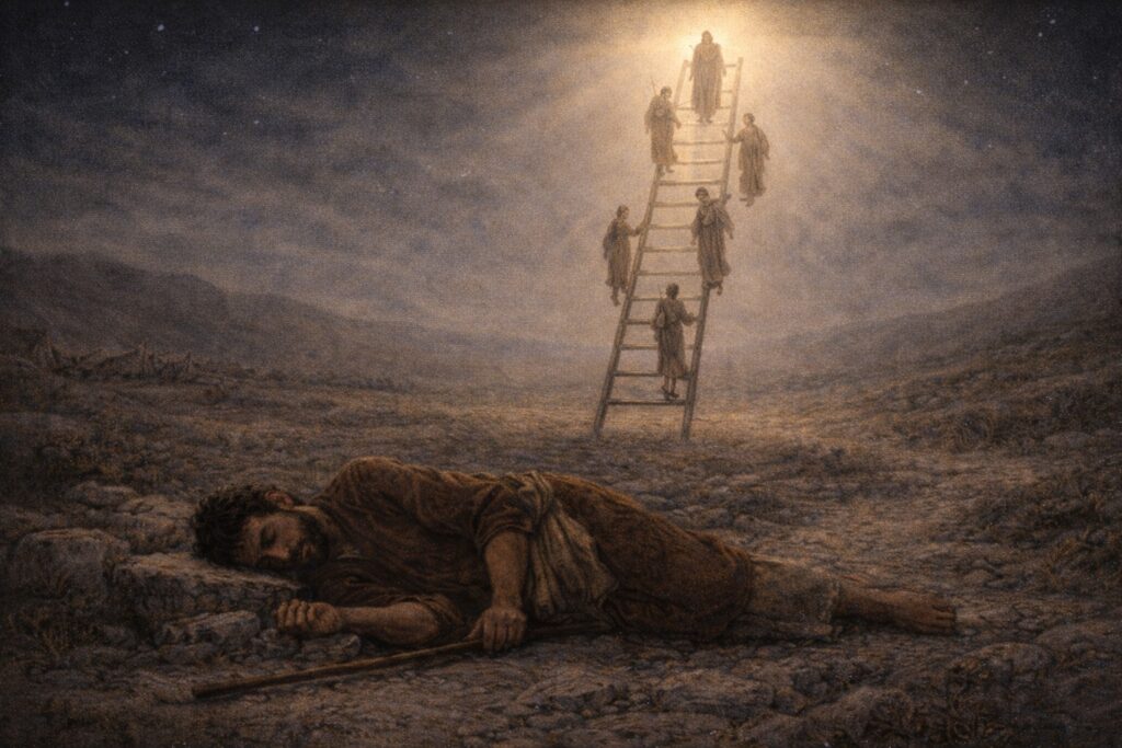 Genesis 28 marks a decisive turning point in Jacob’s journey as he leaves his family and encounters God at Bethel. In a dream, Jacob sees a ladder reaching from earth to heaven, with angels ascending and descending, revealing that heaven remains actively connected to the unfolding story of God’s covenant people. In this moment, God reaffirms the promises first given to Abraham and Isaac: the land, the multiplication of descendants, and the blessing that will reach all nations. Most importantly, God promises His personal presence with Jacob wherever he goes. This chapter shows that the covenant continues not because of human perfection, but because of God’s faithful commitment to His promise.